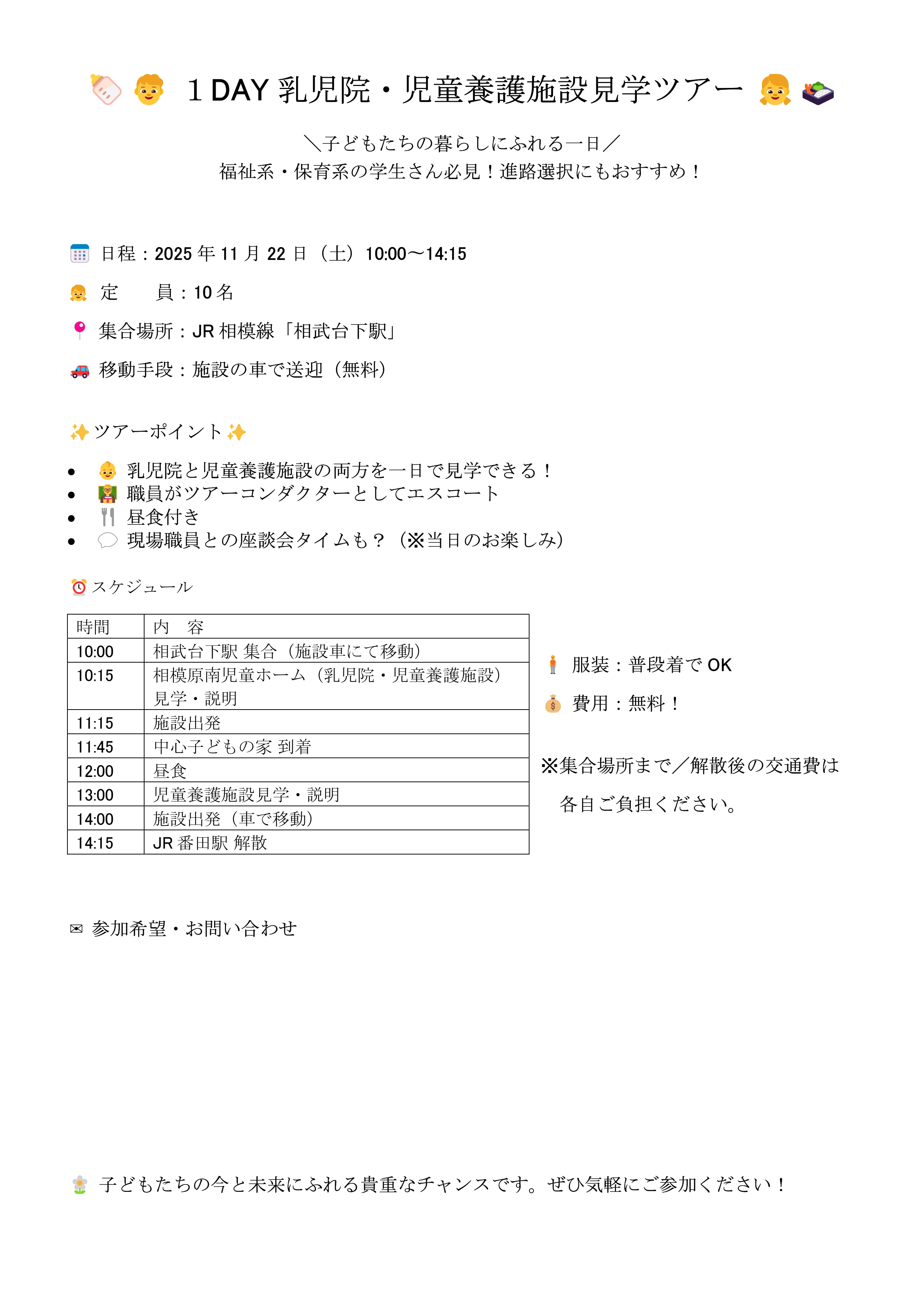 神奈川県 中心子どもの家 児童養護施設 オフライン(対面) 1DAY乳児院・児童養護施設見学ツアー【相模原市内】【11月22日開催】 開催日時 2025/11/22(土) 10:00~14:15 開場時間 2025/11/22 09:45 申込締切 2025/11/19 18:00 詳細を見る