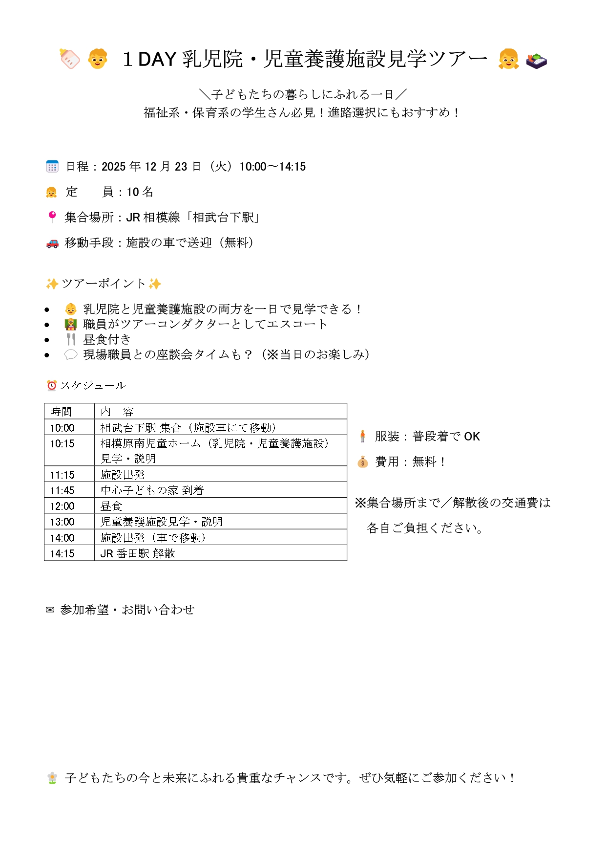 神奈川県 相模原南児童ホーム 児童養護施設 オフライン(対面) 1DAY乳児院・児童養護施設見学ツアー【相模原市内】【12月23日開催】 開催日時 2025/12/23(火) 10:00~14:15 開場時間 2025/12/23 09:45 申込締切 2025/12/20 18:00 詳細を見る