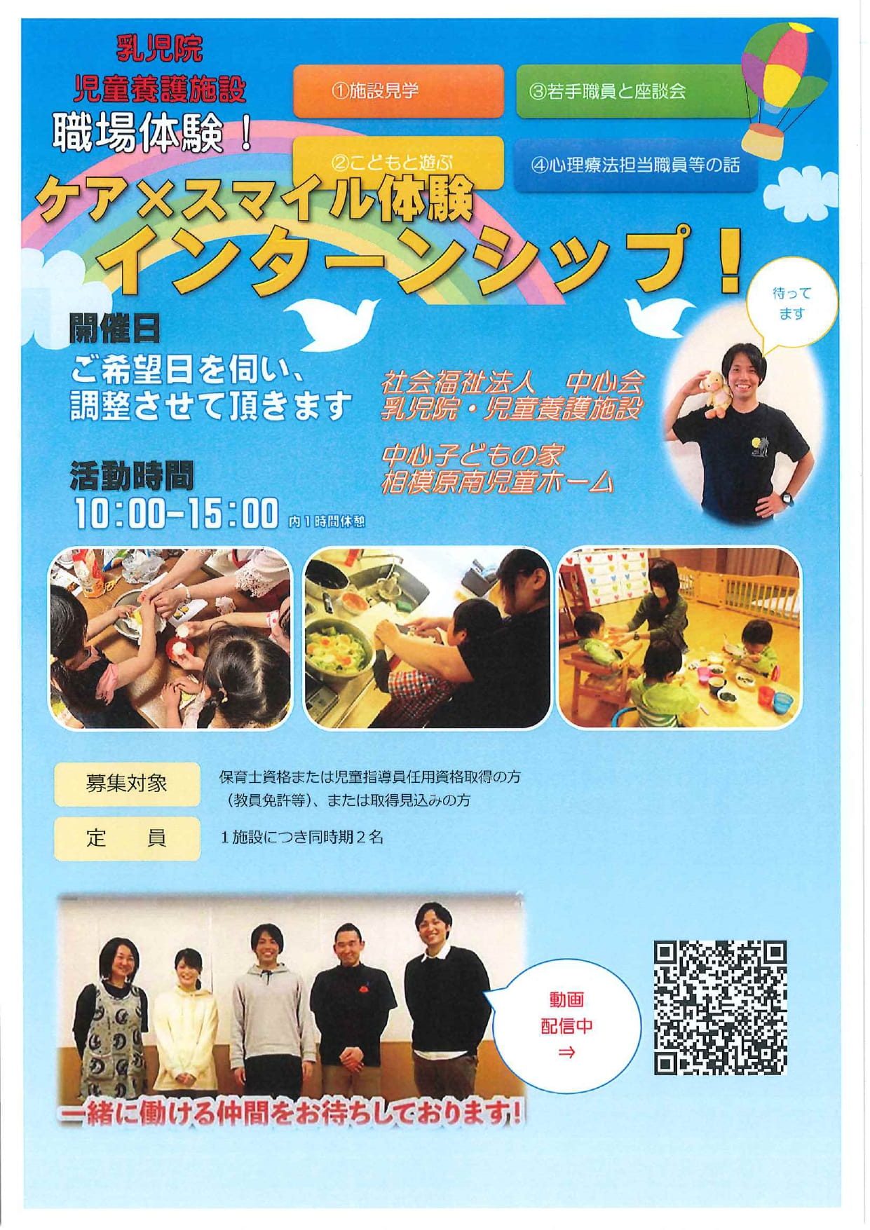 神奈川県 中心子どもの家 児童養護施設 オフライン(対面) 乳児院・児童養護施設 インターンシップ【相模原市内】【随時開催】 開催日時 2026/03/31(火) 10:00~15:00 開場時間 2026/03/31 09:45 申込締切 2026/03/29 18:00 詳細を見る