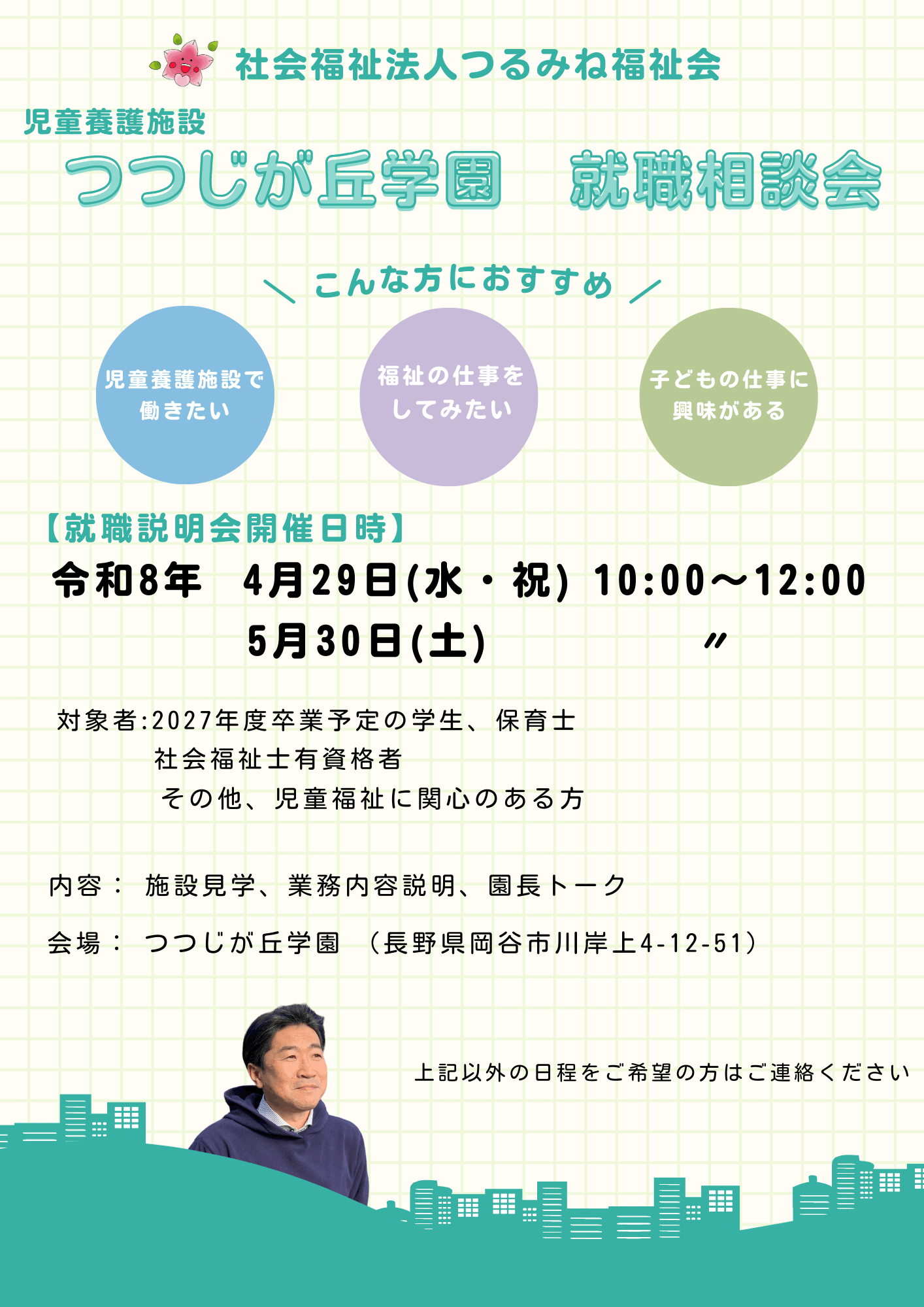長野県 つつじが丘学園 児童養護施設 オフライン(対面) 令和8年度 つつじが丘学園 就職相談会 開催 開催日時 2026/04/29(水) 10:00~12:00 開場時間 2026/04/29 09:45 申込締切 2026/05/29 14:00 詳細を見る