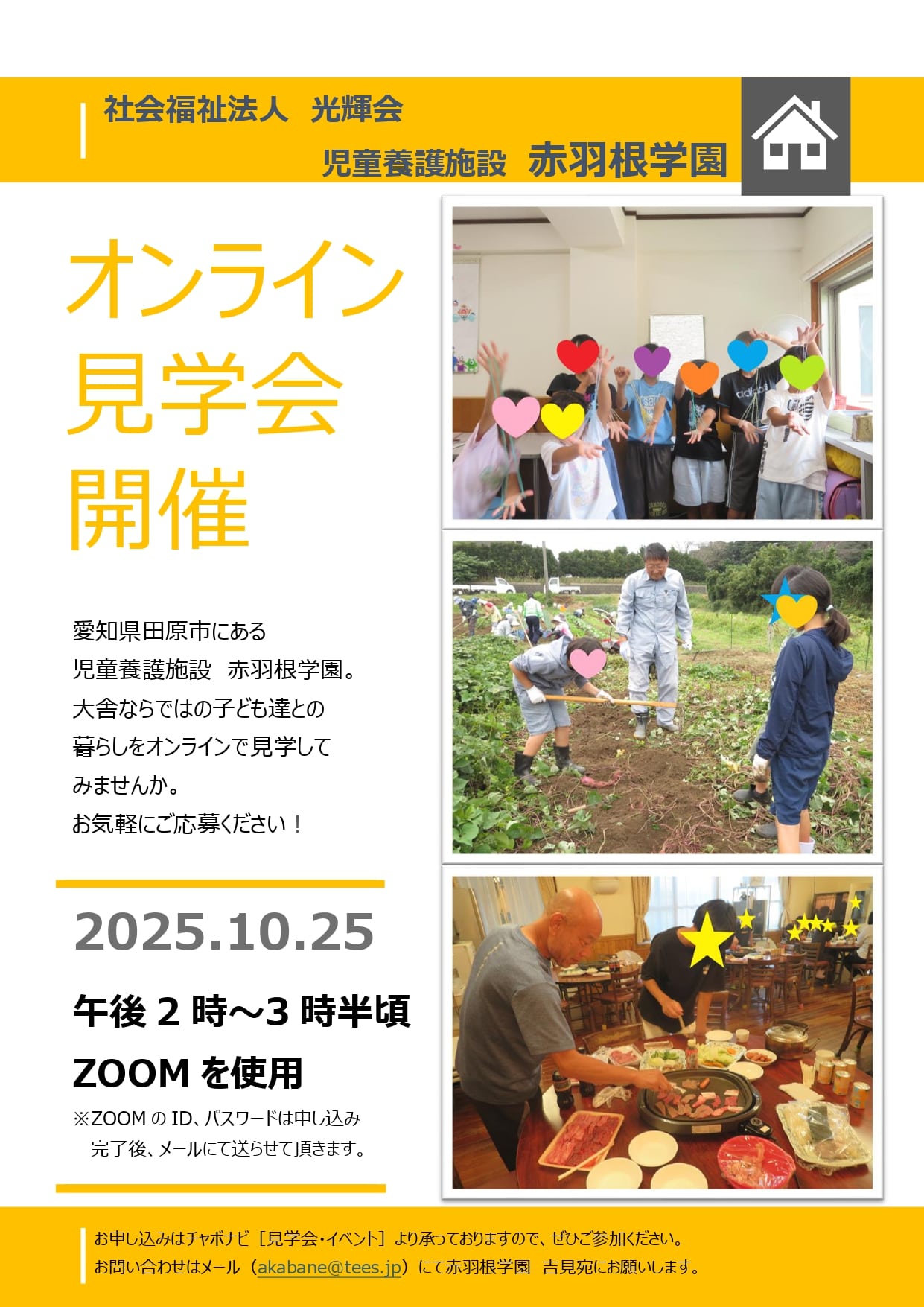 愛知県 赤羽根学園 児童養護施設 オンライン(zoomなど) 10 月25日(土)開催!オンライン見学会 開催日時 2025/10/25(土) 14:00~15:30 開場時間 2025/10/25 13:50 申込締切 2025/10/24 12:00 詳細を見る