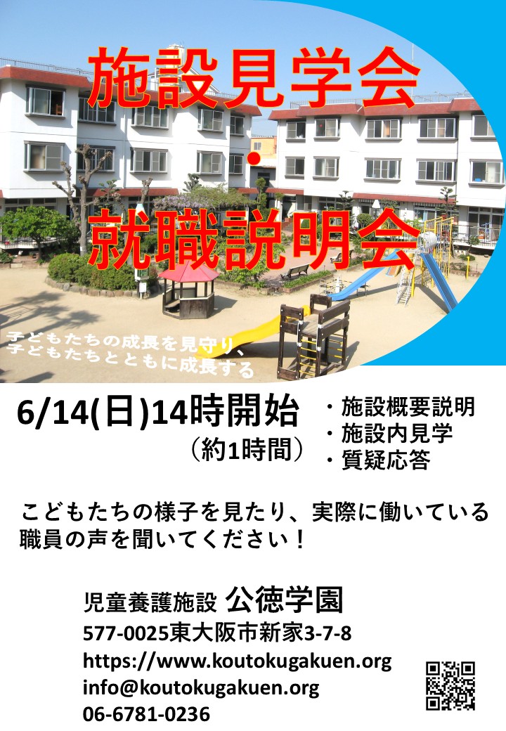 大阪府 公徳学園 児童養護施設 オフライン(対面) 【6月14日開催】公徳学園 施設見学会・就職説明会 開催日時 2026/06/14(日) 14:00~15:00 開場時間 2026/06/14 13:45 申込締切 2026/06/10 17:00 詳細を見る