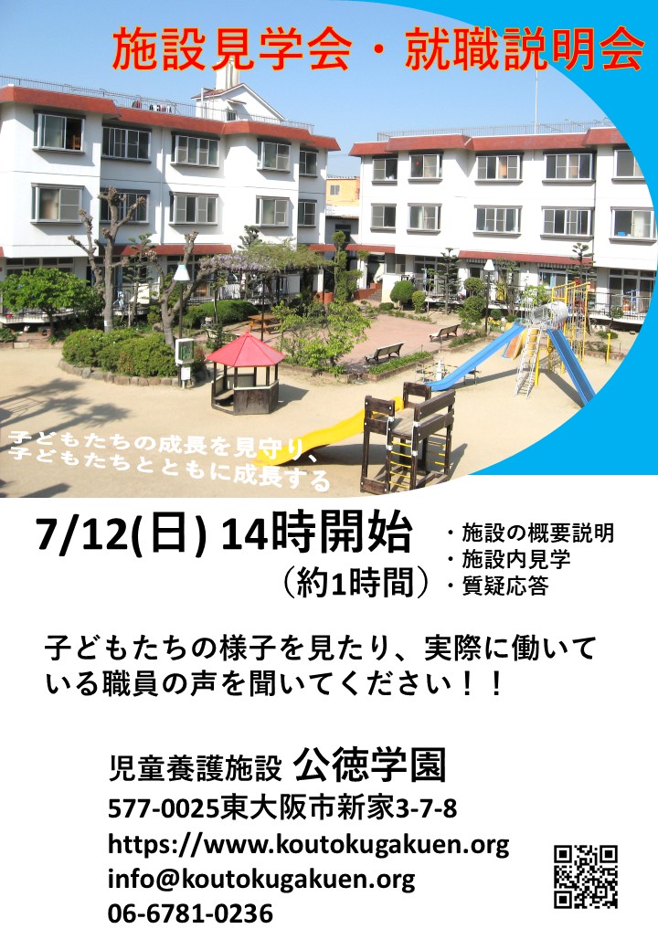 大阪府 公徳学園 児童養護施設 オフライン(対面) 【7月12日開催】公徳学園 施設見学会・就職説明会 開催日時 2026/07/12(日) 14:00~15:00 開場時間 2026/07/12 13:45 申込締切 2026/07/08 17:00 詳細を見る