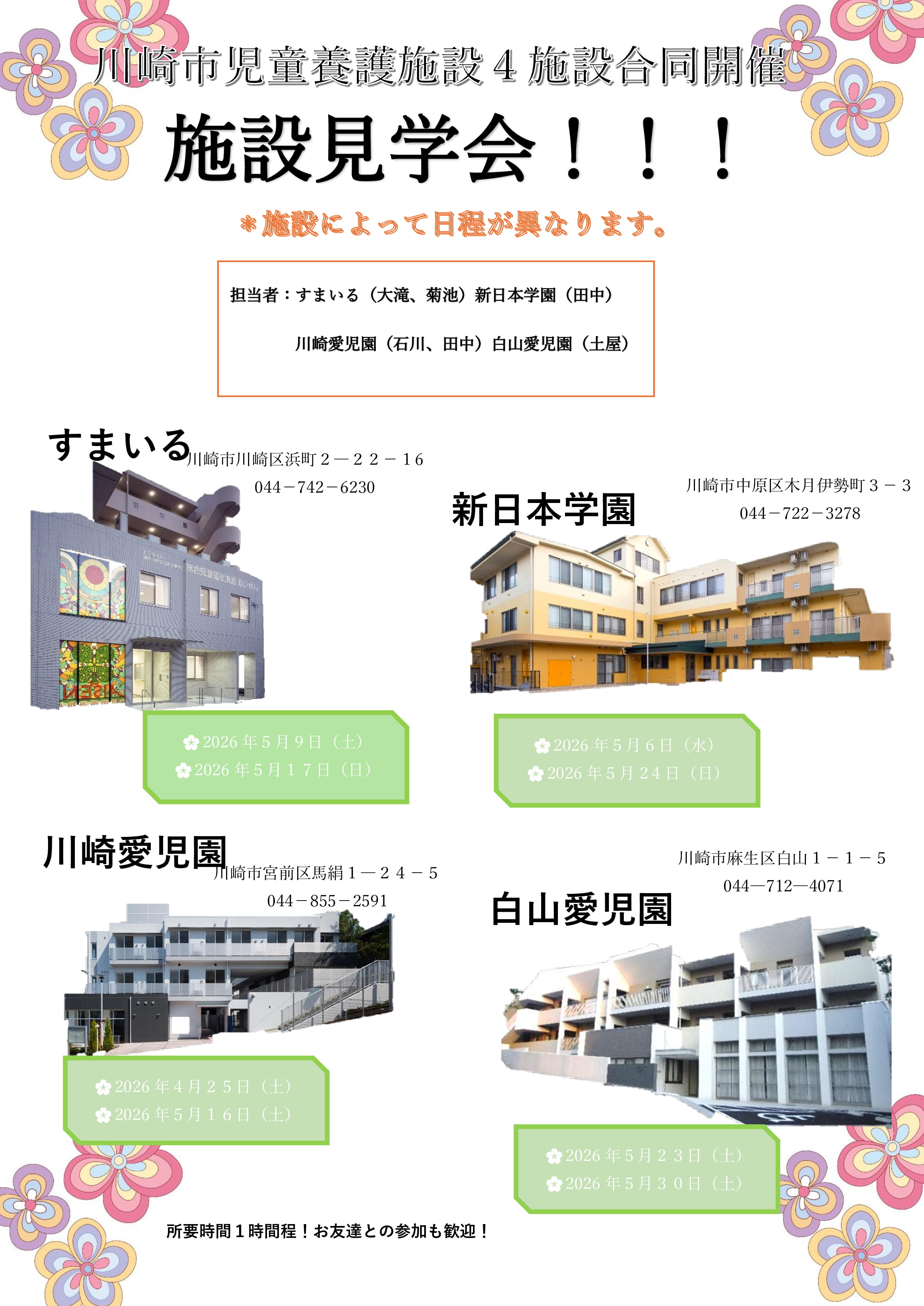 神奈川県 川崎愛児園 児童養護施設 オフライン(対面) 4施設合同開催!児童養護施設見学会 開催日時 2026/04/25(土) 10:00~00:00 開場時間 2026/04/25 09:45 申込締切 2026/05/15 23:59 詳細を見る