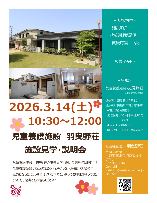 大阪府 羽曳野荘 児童養護施設 オフライン(対面) 3月14日(土)施設見学・説明会開催! 開催日時 2026/03/14(土) 10:30~12:00 開場時間 2026/03/14 10:15 申込締切 2026/03/14 00:00 詳細を見る