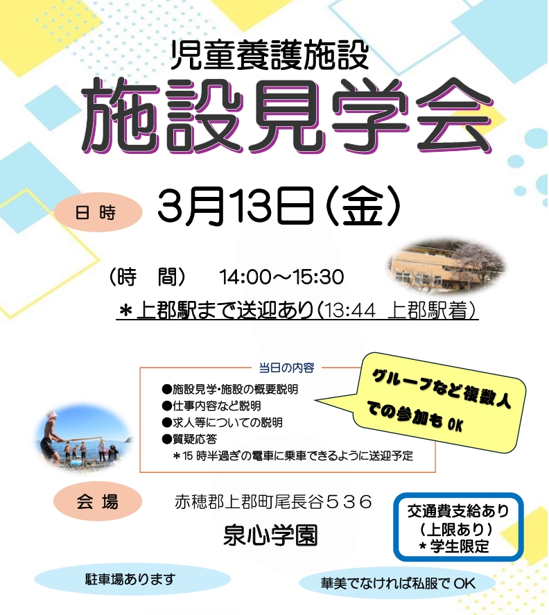 兵庫県 泉心学園 児童養護施設 オフライン(対面) 令和8年3月13日施設見学会を開催!(アルバイト希望者も大歓迎) 開催日時 2026/03/13(金) 14:00~15:30 開場時間 2026/03/13 13:45 申込締切 2026/03/10 15:00 詳細を見る