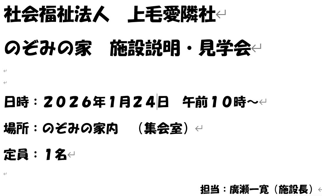 群馬県 のぞみの家(母子生活支援施設) 母子生活支援施設 オフライン(対面) 第3回 施設見学会 開催日時 2026/01/24(土) 10:00~11:00 開場時間 2026/01/24 09:45 申込締切 2026/01/23 17:00 詳細を見る