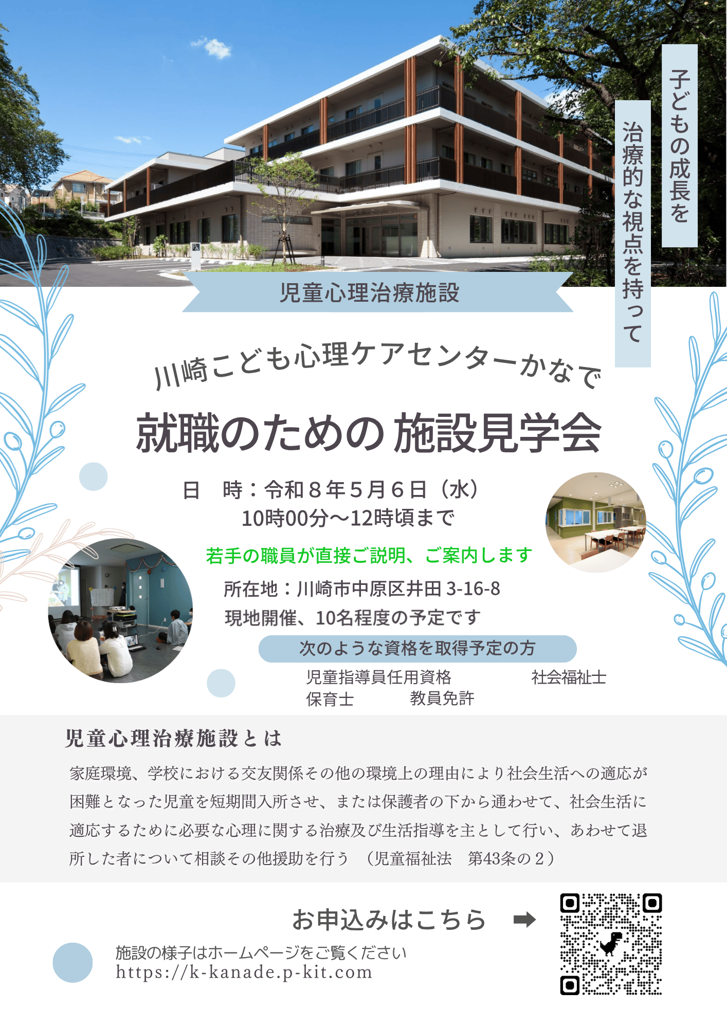 神奈川県 川崎こども心理ケアセンターかなで 児童心理治療施設 オフライン(対面) 就職のための施設見学会 開催日時 2026/05/06(水) 10:00~12:00 開場時間 2026/05/06 09:45 申込締切 2026/05/05 17:00 詳細を見る