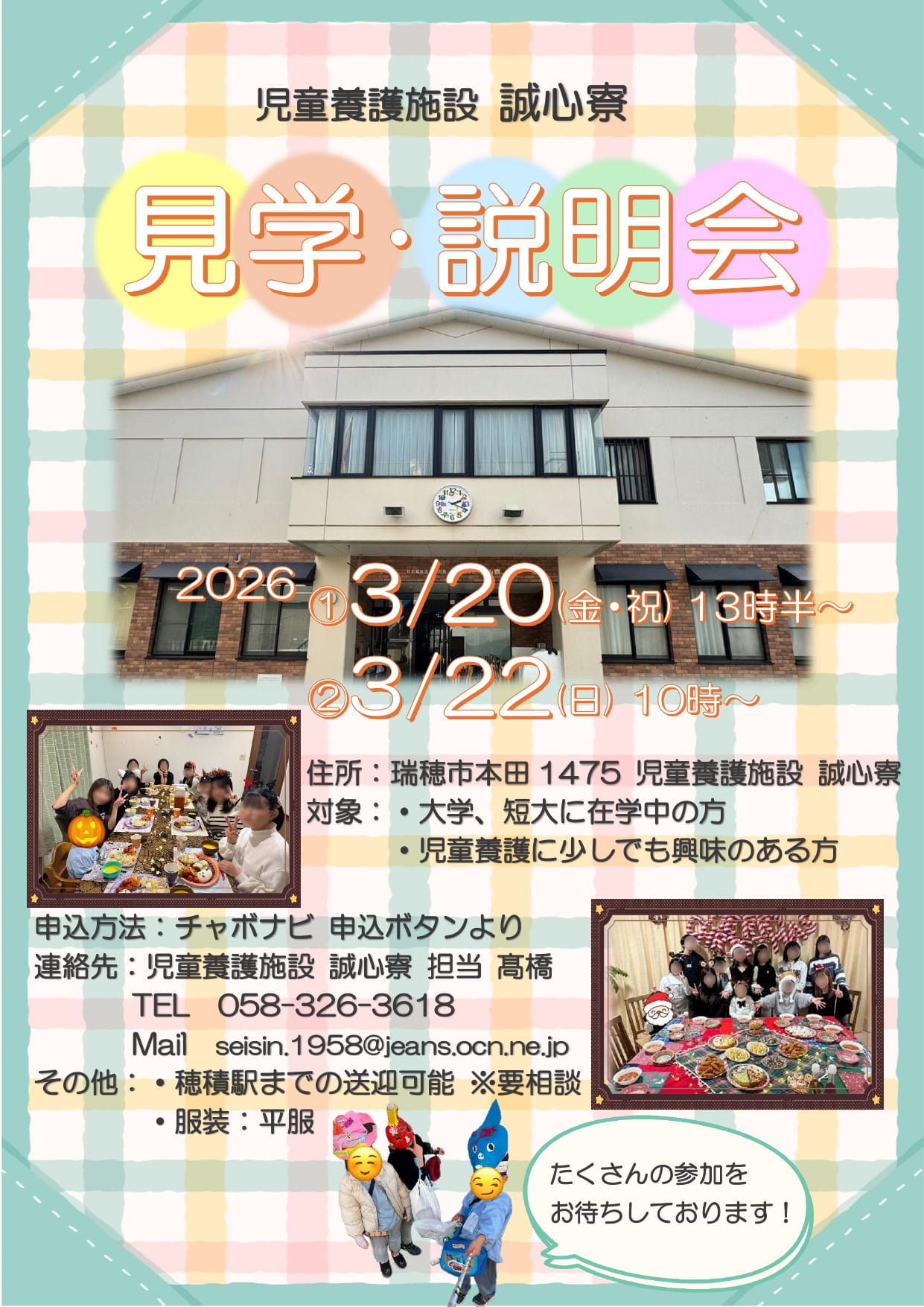 岐阜県 誠心寮 児童養護施設 オフライン(対面) 3/20 誠心寮 見学説明会 開催日時 2026/03/20(金) 13:30~15:00 開場時間 2026/03/20 13:15 申込締切 2026/03/17 22:00 詳細を見る
