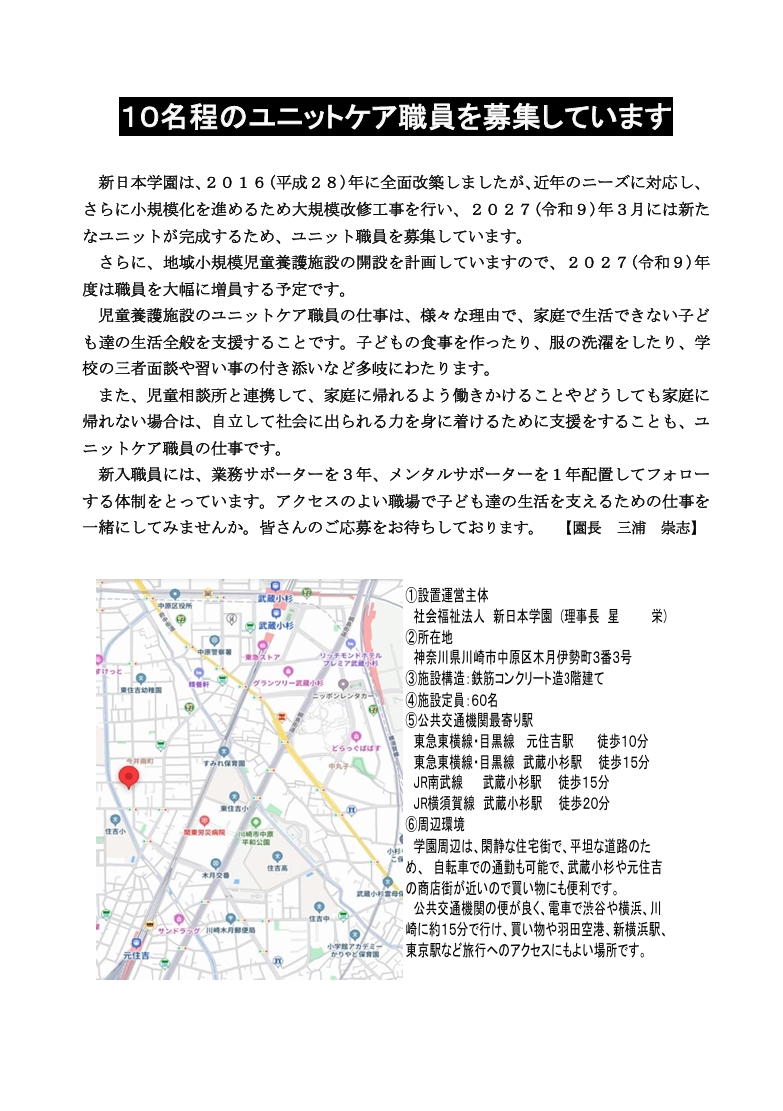 その他:職員寮完備(ワンルーム寮費月額¥10,000)、川崎市宿舎借り上げ事業による家賃自己負担軽減有り(¥82,000を超える家賃は自己負担)、職員旅行有り、研修費補助、職員交流費