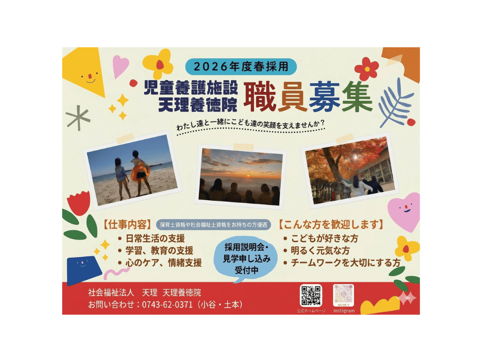 天理養徳院は、奈良県天理市にある児童養護施設です。 こどもたちが「家庭に近い環境」で安心して暮らせるよう、各ホームが小規模制、住み込み職員を配置して日々の生活…