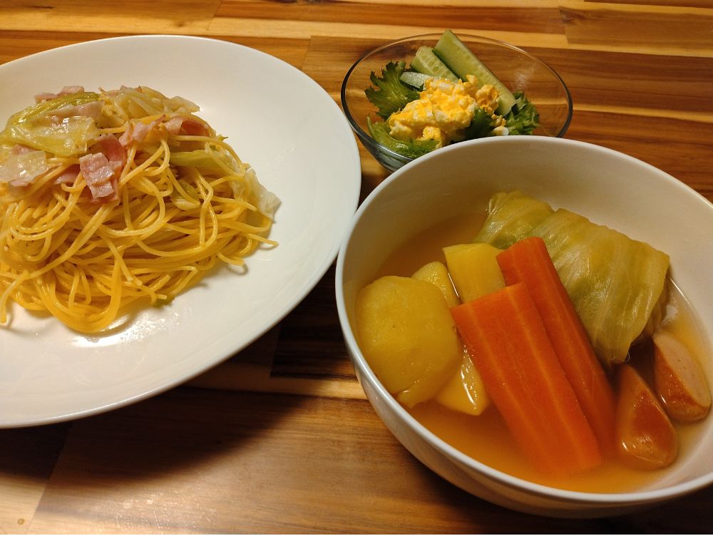 [夕食(ペペロンチーノ、ロールキャベツ)]
