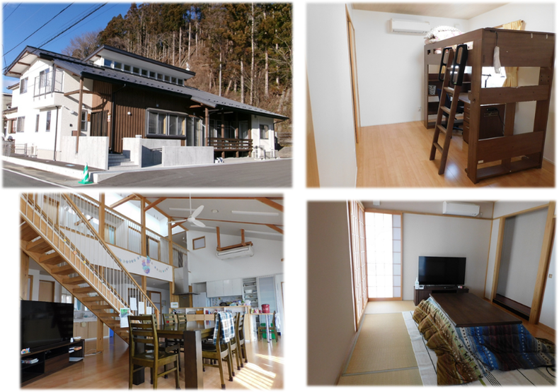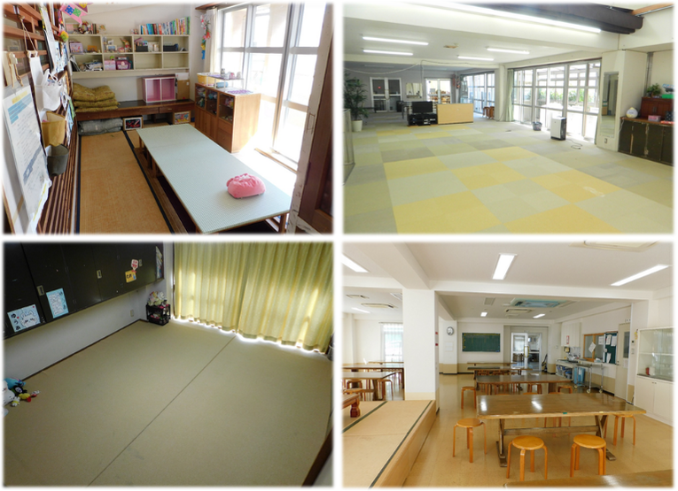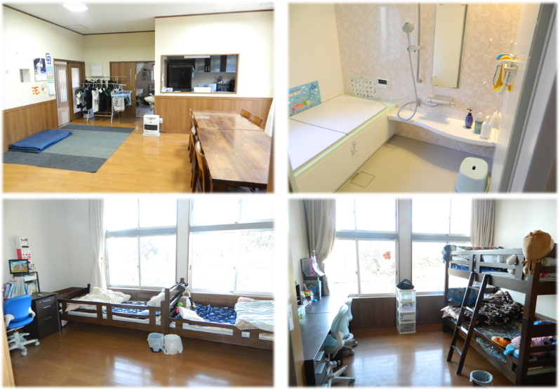 [【本園】(左上)各お部屋のリビングである居室・(左下)横割りで一緒に寝る寝室・(右上)全体のリビングであり、自由に過ごせるホール ・(左下)みんなでご飯を食べる食堂☆]