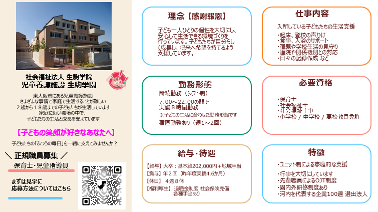 生駒学園で未来の子どもたちを支える一員として、共に歩んでいきませんか?住宅地にひっそりとたたずむ児童養護施設生駒学園は、2023年12月に創立100周年を迎えました。お寺での保護養育から始まり、現在の形に至るまで、私たちは常に子どもたちの未来を見守り、支え続けています。