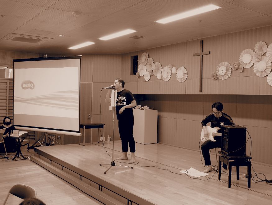 [礼拝では出し物をやることもあります!(職員バンドの様子)]
